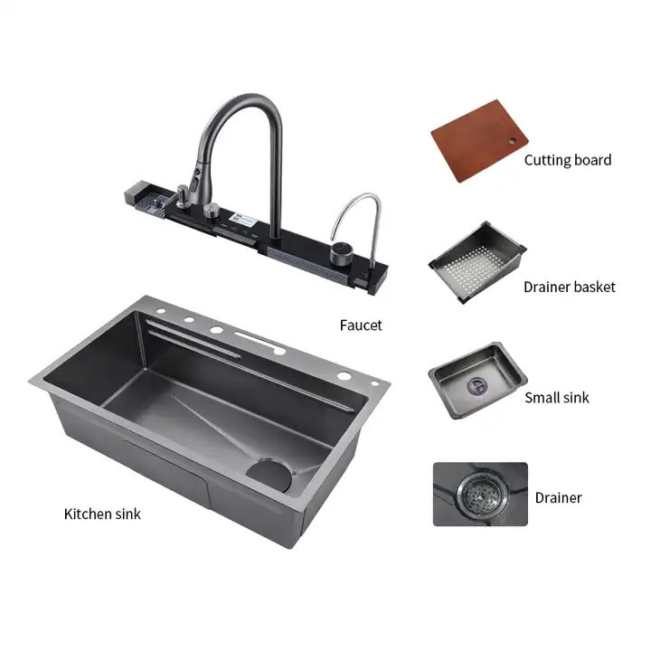 فول آپشن ترین سینک پیانویی رنگ سینک دودی مشکی ،5 کلید شامل لیوان شور اتوماتیک ، شیر تسویه آب اتوماتیک ، 2 آبشار ، جامایع ، دیمر درجه آب ، نمایشگر دیجیتالی ، تخته چوبی ، 2 عدد سبد استیل. تمیز کردن و نگهداری آسان سطح نانو ، ارسال ایمن سراسر کشور ، با نمایشگر دیجیتال ، ابعاد سینک آبشاری بارانی 46x75 ، استنلس استیل مشکی 304 ، کلید پیانویی جهت بازو بسته کردن شیرها