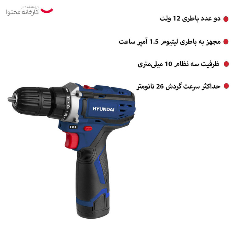 دارای دو عدد باطری 12 ولت می باشد مجهز به باطری لیتیوم 1.5 آمپر ساعت می باشد دارای ظرفیت سه نظام 10 میلیمتری می باشد امکان کار با حداکثر سرعت گردش 26 نانومتر می باشد دارای کارکرد با سرعت 0-400 تا 0-1600 دور بر دقیقه می باشد